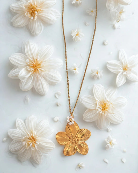 Collier fleur dorée et perles – Élégance naturelle & féminité